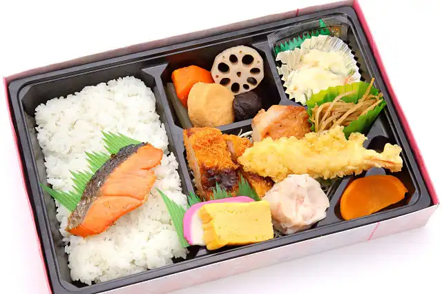 煮物、ポテトサラダ、季節の揚げ物、チキンステーキ、きんぴらごぼう、天ぷら、焼売、かまぼこ、玉子焼き、漬物、醤油