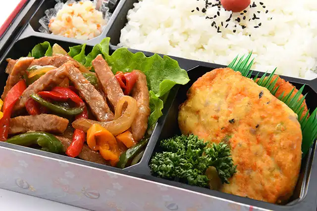 めちゃうま亭~7時からお届け可能なイベント・会議用の宅配弁当~の【得得】チンジャオロースと豆腐ハンバーグのめちゃうま幕の内が宅配弁当でお楽しみいただけます。緑黄色野菜のチンジャオロースと豆腐ハンバーグの弁当です。会議やランチミーティングなど、ご利用シーンに合わせてご注文ください。