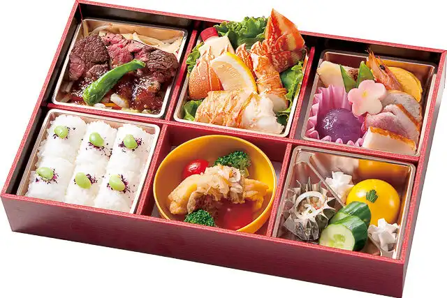 鯛の西京焼き、出汁巻き玉子、若鶏三色巻、合鴨スモーク、海老柴煮、白身魚の南蛮漬け、大根なます、香の物、甘味、季節のお惣菜