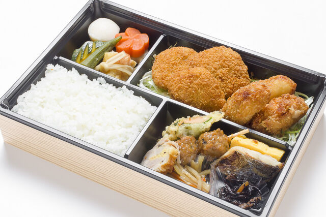 武やがご提供する仕出し弁当。おすすめのヒレカツミックス御膳をオフィスやご自宅でお楽しみください。ヘルシーなヒレカツとカキフライをミックスしたボリューム満点のお弁当です。自家製出汁をじっくり染み込ませた特製煮物もぜひご賞味ください。