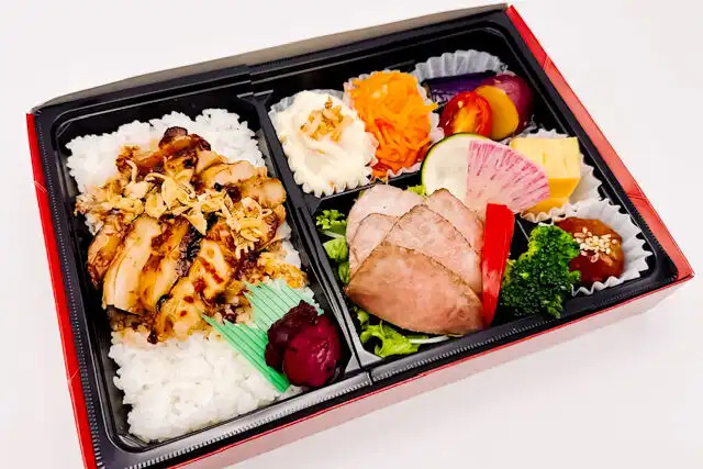 特製ダレに漬け込んだ若鶏を炙り焼にして乗せたご飯に、厳選した黒毛和牛のA5カルビステーキのお弁当です。黒毛和牛の旨味を一番感じられる商品です。