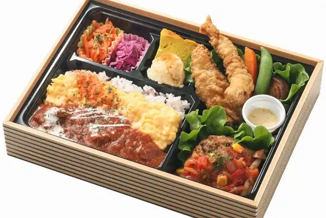 自家製ハッシュドビーフをかけたトロたまライスに、特製ハニーマスタードソースで食べる海鮮フライと野菜たっぷりラタトゥイユソースの手作りハンバーグも付いた欲張り弁当。