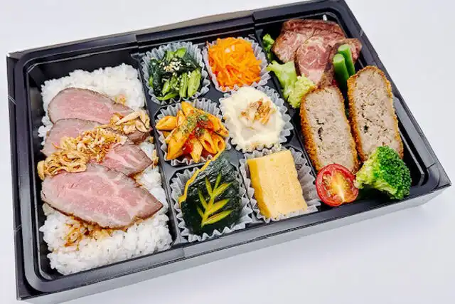 ごはん(150g)、黒毛和牛ローストビーフ、牛ハラミ、国産牛メンチカツ、添え野菜、玉子焼き、パスタ、季節の惣菜
