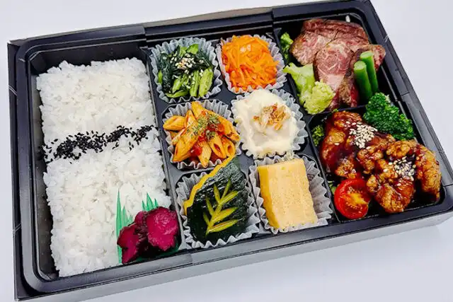 ごはん(150g)、漬物、牛ハラミ、黒酢唐揚げ、添え野菜、玉子焼き、パスタ、季節の惣菜