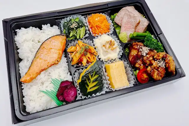 ごはん(150g)、鮭の塩焼き、漬物、黒毛和牛A5カルビ、黒酢唐揚げ、添え野菜、玉子焼き、パスタ、季節の惣菜