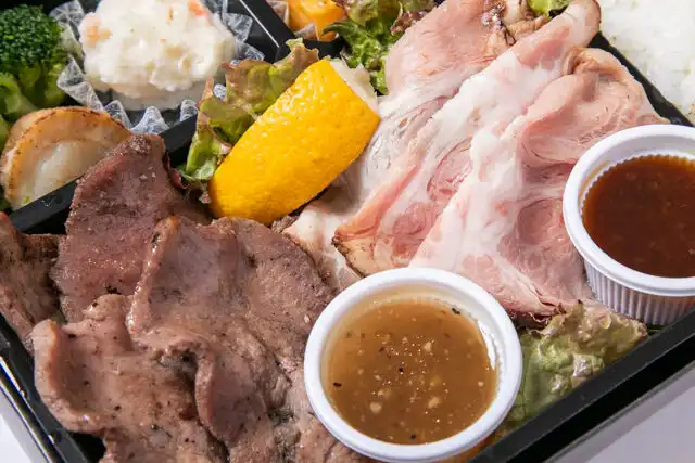ご飯(200g)/牛タン/ローストポーク/ブロッコリー/ポテトサラダ/バターとホタテのグリル/餡掛け卵焼き/煮豆/キャロットサラダ/レモン/ステーキソース/塩ダレ