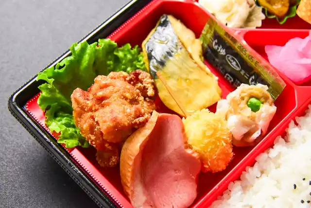 【ごはん】 白米200g、漬物 【おかず】 <主菜> 鯖塩焼き <副菜> 鶏団子とナスの甘酢、ポテトサラダ、玉子焼き、ざんぎ1個、カモスモーク、うずら串カツ、シューマイ、ひじきの煮物、きんぴらごぼう