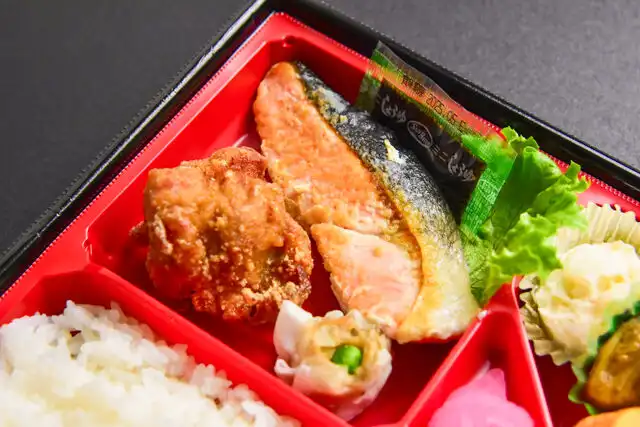 お店で1つ1つ塩を振って焼きました。食べやすい骨なしの人気のお弁当です。惣菜や卵焼きもお店の手作りで、オリジナルな定番弁当です。