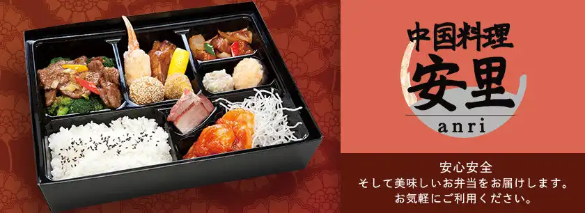 中国料理 安里の謹製弁当 紅葉を宅配弁当でご提供いたします。当店で長年ご愛顧いただきましたお弁当『紅葉』をリニューアルしました。丁寧な手仕事をモットーに、選び抜いた野菜と食感プリプリのエビは塩味との相性は抜群。鶏肉と蓮のピリ辛炒めでアクセントを効かせ、当店自慢のシューマイとエビシューマイを詰め込み、ご飯にチャーシューを乗せました。華やかでいろいろな味を楽しんでいただけます。熨斗対応もいたします!法事やおもてなしの席、歓送迎会や卒業式や入学式、様々なシーンにご利用いただけます。ご利用お待ちしております。