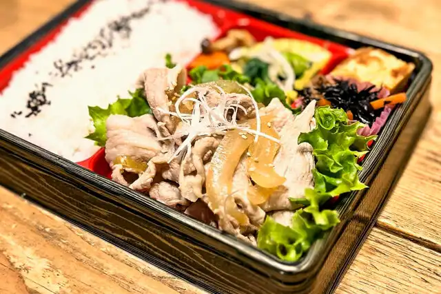 【ごはん】白米180g、ごま【おかず】<主菜>国産豚の焼肉、レタス<副菜>卵焼き / 青菜のお浸し / 煮物 / レンコンのピリ辛オイスターソース炒め