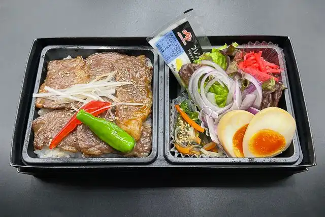 みんな大好き焼肉弁当、牛カルビがドーンと6枚!煮玉子とナムルも良い味だしてます。迷ったらコレ!