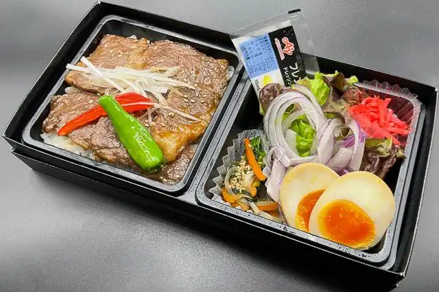 【ごはん】白米200g【おかず】<主菜>牛カルビ焼肉(牛肉、たれ、長ネギ、しし唐、パプリカ)<副菜>煮玉子、ナムル(もやし、ほうれん草、人参、ごま)、レタス、玉ねぎ、ドレッシング、紅ショウガ
