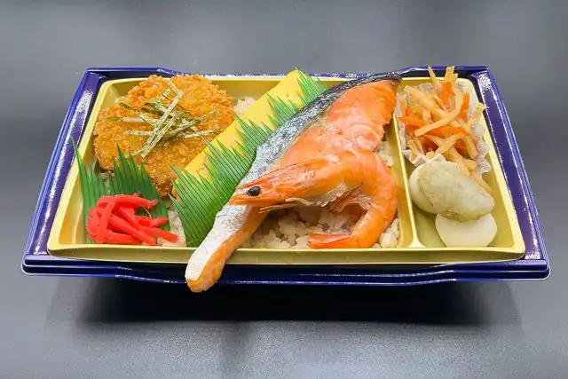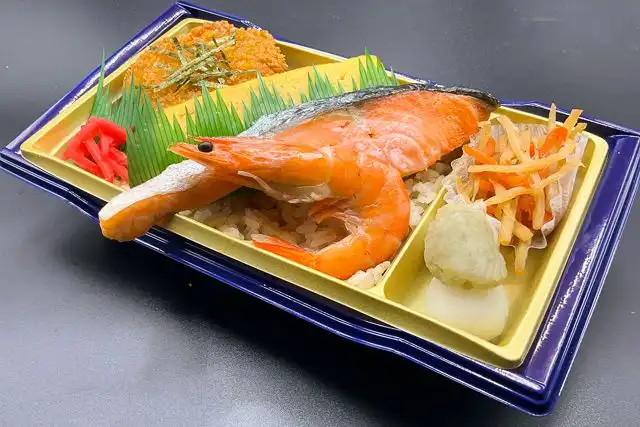 鮭の塩焼きとタレカツが際立つ、豪華なのっけ弁当です。