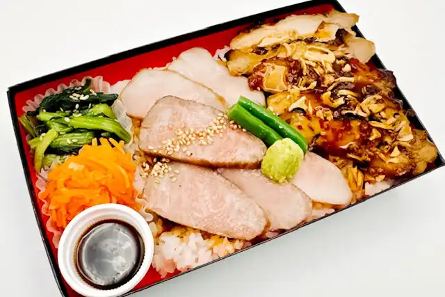 厳選した黒毛和牛のA5ランクのみを使用したステーキと特製ダレに漬け込んだ若鶏の炙り焼で作ったお重です。お肉を思う存分味わっていただきたいという想いを込めて作りましたお重です。