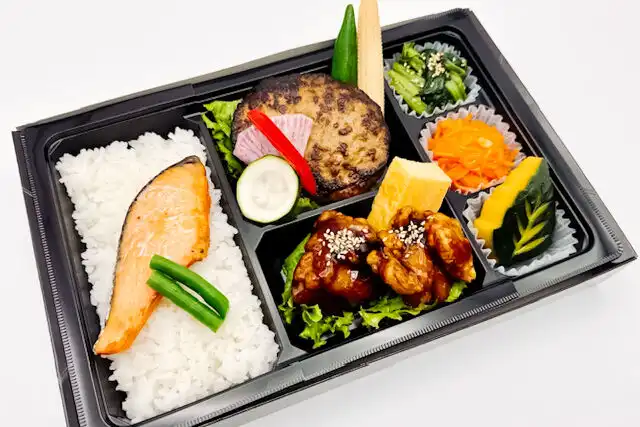 ごはん(150g)、鮭の塩焼き、ハンバーグ、唐揚げ、黒酢ソース、玉子焼き、副菜3種、添え野菜