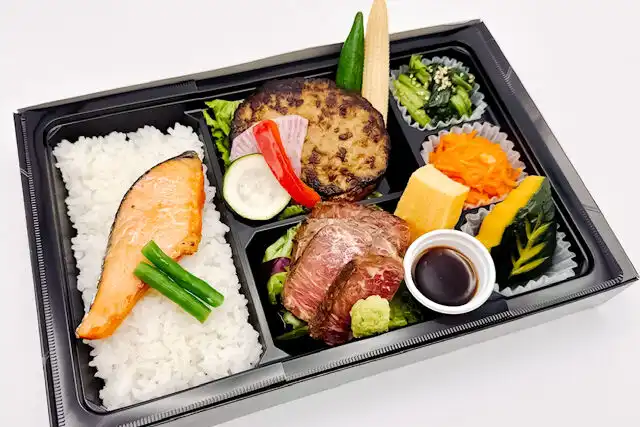 鮭の塩焼きを乗せたご飯に、ボリュームたっぷりのやわらかハンバーグと赤身がヘルシーで人気の牛ハラミステーキをメインにした肉たっぷりなお弁当です。牛ハラミステーキは固くならないよう火入れに力を入れております。