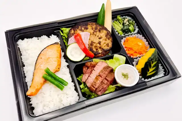 鮭の塩焼きを乗せたご飯に、ボリュームたっぷりのやわらかハンバーグと牛たん塩焼き(山芋とろろ付き)をメインにした肉たっぷりなお弁当です。牛たんをは冷めても固くならないよう火入れには時間を掛けて調理しております。