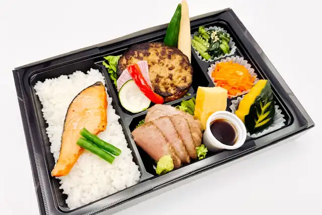 鮭の塩焼きを乗せたご飯に、ボリュームたっぷりのやわらかハンバーグと黒毛和牛A5カルビステーキをメインにした肉たっぷりなお弁当です。厳選した黒毛和牛のA5ランク肉は冷めていても肉汁の旨味が口の中に湧き出てきます!