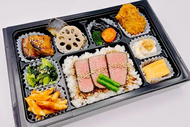 厳選した黒毛和牛ステーキを乗せたご飯に、沢山の種類のおかずを少しずつ楽しめるお弁当です。各種会議イベント、気の合う仲間との大切な時間に是非ご利用ください。