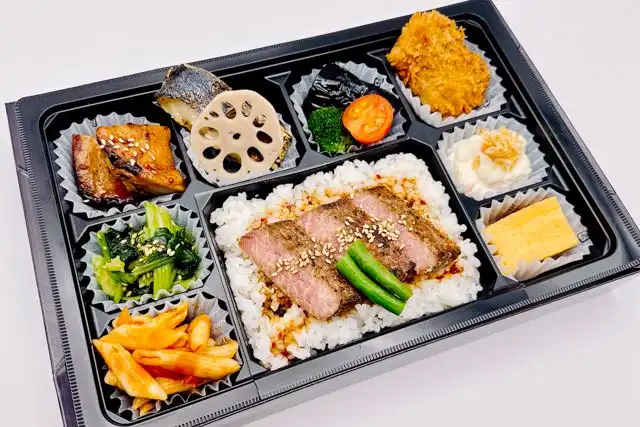 特選サーロインステーキを乗せたご飯に、沢山の種類のおかずを少しずつ楽しめるお弁当です。各種会議イベント、気の合う仲間との大切な時間に是非ご利用ください。