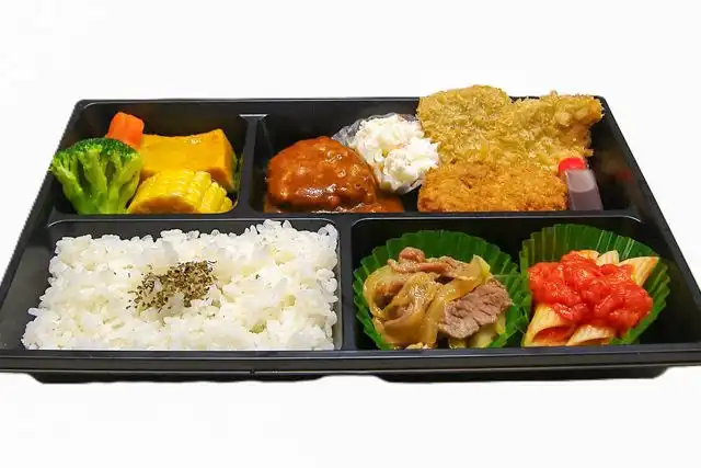 デミグラスソースがかかったジューシーなハンバーグをメインに、ロースカツやコロッケ、副菜には彩り野菜をたっぷり使用し、見た目には華やかな逸品です。ランチミーティングやご家族でのお集まりなど、ご利用シーンに合わせてデリバリーいたします。