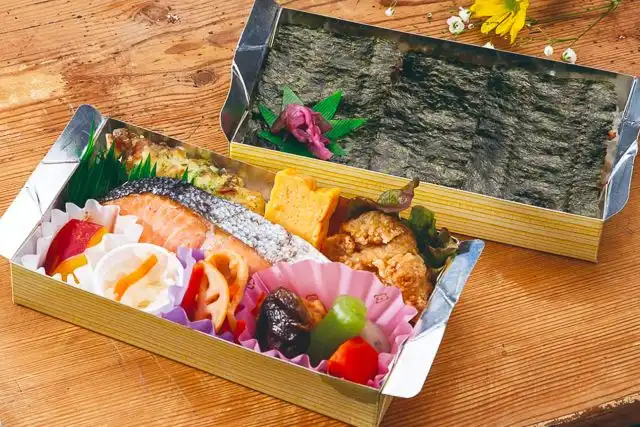 ご飯180g、鮭塩焼き、鶏唐揚げ、竹輪磯部揚げ、煮物炊き合わせ、厚焼き玉子、きんぴら蓮根、さつま芋レモン煮、なます、香の物