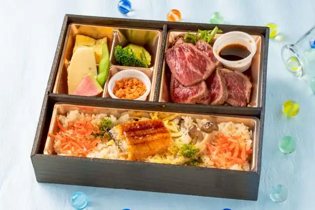 ごはん180g/うなぎ蒲焼/香ばしさが増した熟成厳選牛ステーキ/鮭そぼろ/蕎麦屋のたまご焼き/筍/ブロッコリー