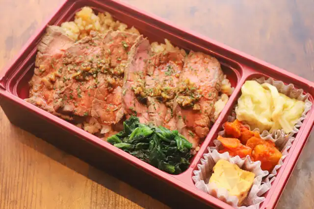 BODEGAがご提供する仕出し弁当。おすすめの自家製ローストビーフ弁当をオフィスやご自宅でお楽しみください。是非一度はご賞味頂きたい当店自慢のボリューム満点ローストビーフ弁当です。自家製ソースと共にご堪能ください。ロケ弁やご家族でのお集まりなど、ご利用シーンに合わせて配達いたします。