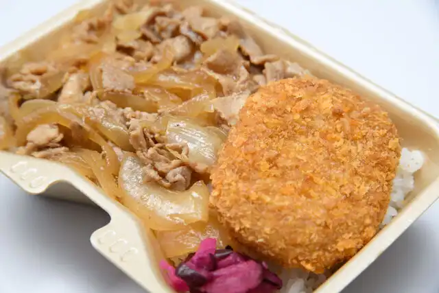 【ごはん】白米200g【おかず】<主菜>豚焼肉、コロッケ、しば漬け、トンカツソース