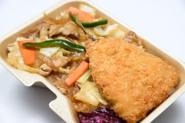 【ごはん】白米200g【おかず】<主菜>豚野菜炒め、アジフライ、しば漬け、トンカツソース