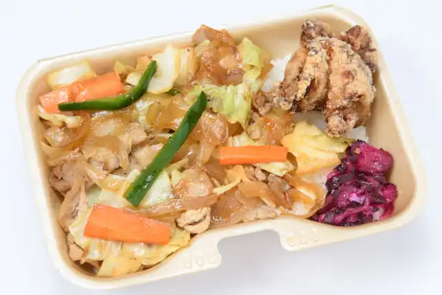 【ごはん】白米200g【おかず】<主菜>豚野菜炒め、唐揚げ、しば漬け