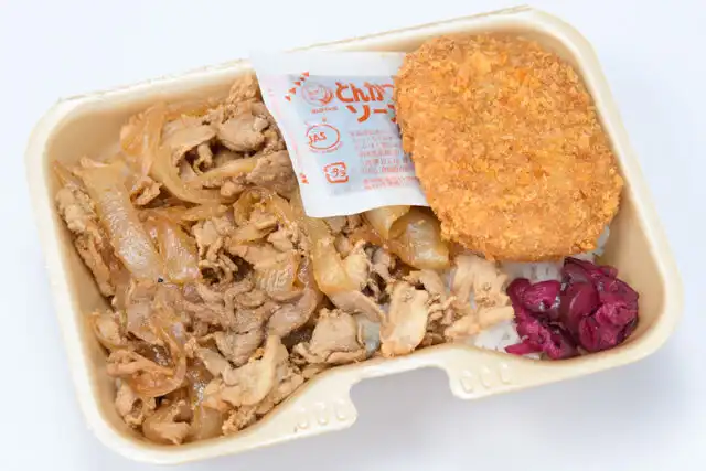 【ごはん】白米200g【おかず】<主菜>豚生姜焼き、コロッケ、しば漬け、トンカツソース