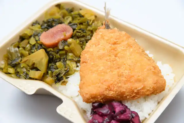 【ごはん】白米200g【おかず】<主菜>高菜、明太子、アジフライ、しば漬け、トンカツソース
