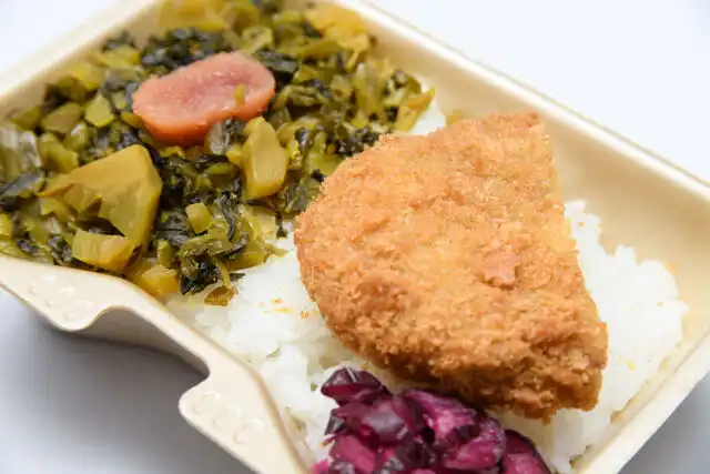 あっさりとした高菜とガッツリのメンチカツの組み合わせです。