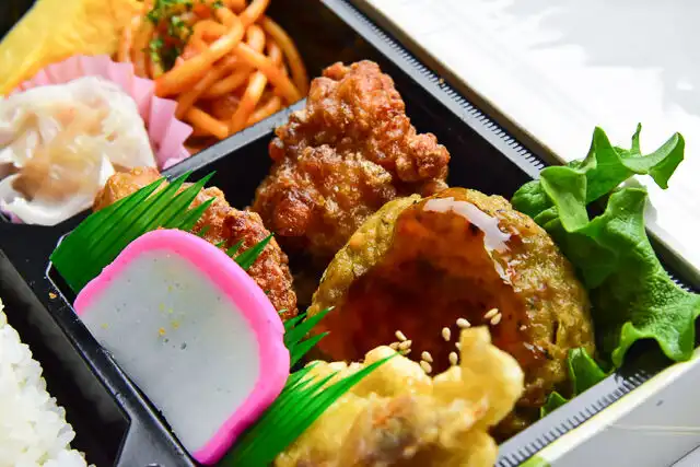 女性に人気のヘルシーな豆腐ハンバーグは当店で人気のお弁当です。デラックスな副菜を合わせて、見栄えの良い箱容器のお弁当を作りました。
