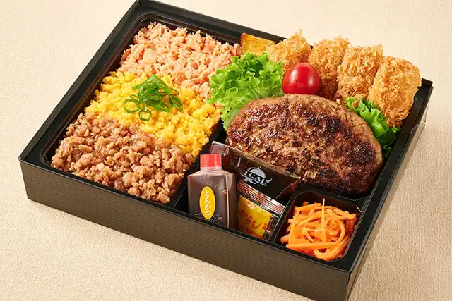 神田 福よしの三色そぼろはんばーぐ&ロースカツ弁当を仕出し弁当でご提供いたします。ハンバーグとロースカツの大ボリュームコンビと3色そぼろごはんを味わう最強トリオ弁当。彩り豊かなたっぷり野菜のおかずとご一緒にお楽しみください。ロケ弁やランチミーティングなど、ご利用シーンに合わせて配達いたします。