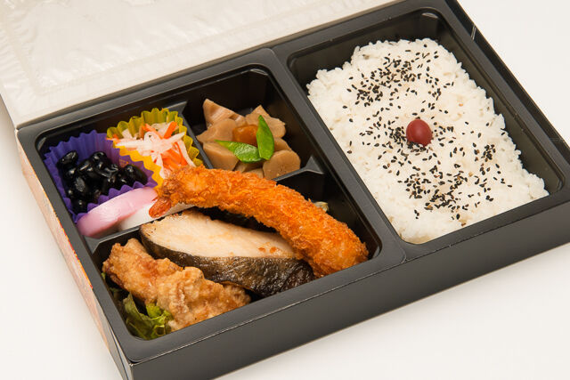 ご飯(ごま塩・梅干し)[約200g]/ 銀鱈西京焼き / とり天 / エビフライ / 野菜の煮物 / なます / 黒豆 / かまぼこ