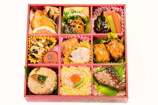 蟹ととびっこ彩寿司 / 博多地鶏飯 / 寒ブリの照り焼き飯 / 蟹と季節野菜の天麩羅盛り / 蟹しゅうまい / 鶏の香味揚げ甘酢餡 / あさりの昆布和え / 蓮根と旬彩の胡麻和え / 玉子焼き / ロールキャベツ / 季節の炊き合わせ / 季節の甘味(写真は柿餅)