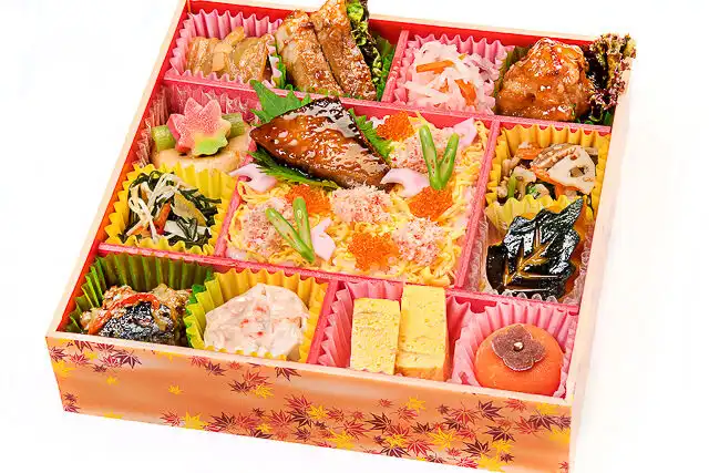 蟹と寒ブリのちらし寿司 / 糸島豚ロースステーキ / 蟹しゅうまい和風餡 / ロールキャベツ / 鶏の香味揚げ甘酢餡 / あさりの昆布和え / 蓮根と旬彩の胡麻和え / 大根サラダ / 木の葉南瓜炊き合わせ / 紅白なます / 榎と昆布の柚子和え / 玉子焼き / 季節の甘味(写真は柿餅)