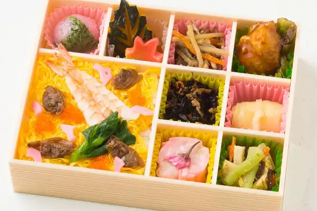 春のちらし寿司(えび、あさり、トビコ、錦糸卵、小松菜、花蓮根)/桜しゅうまい/季節野菜の胡麻和え/ロールキャベツ/ひじき煮/鶏の香味揚げ/きんぴらごぼう/炊き合わせ/さくら餅