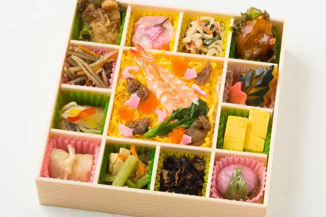 春のちらし寿司(えび、あさり、トビコ、錦糸卵、小松菜、花蓮根)/豚ステーキ/桜しゅうまい/大根サラダ/鶏の香味揚げ/炊き合わせ/玉子焼き/さくら餅/ひじき煮/小松菜の胡麻和え/ロールキャベツ/あさり昆布/きんぴらごぼう