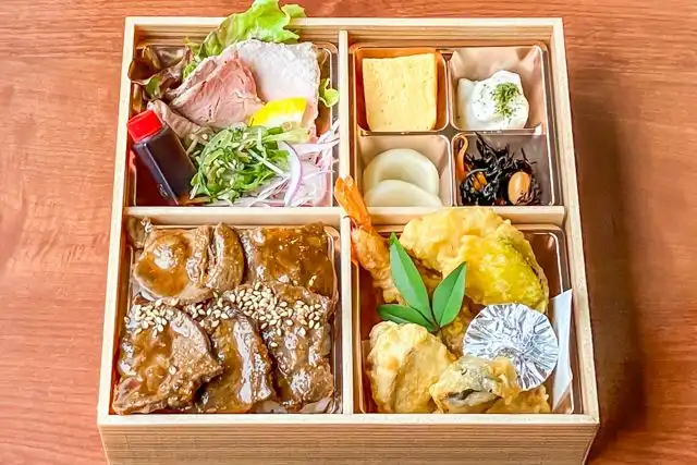 焼肉重(ご飯150g)/エビと春野菜の天ぷら/ローストポーク/だし巻き玉子/ポテトサラダ/ひじき煮/大根の浅漬け/タレ
