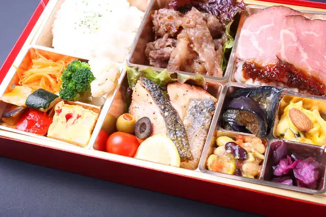 ごはん120g / 黒毛和牛赤ワイン煮/サーモンのムニエル/ローストビーフ/ キッシュ / ニンジンラペ / カリフラワードレッシング和え / パプリカのオリーブオイル炒め / ナスのジンジャーソース和え / ポテトサラダ / 根菜サラダ / 漬物