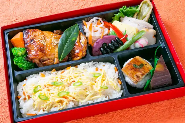 新年・年始限定!の照り焼きチキン。色とりどりのオードブルとご一緒に。ちらし寿司・お赤飯・白米とお選びいただけます。シーンに合わせてチョイスください。