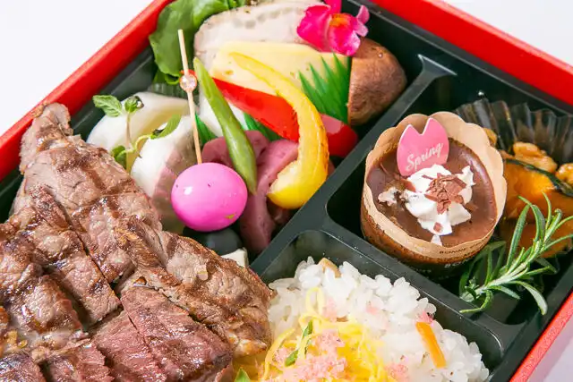 春のシーズンにあわせて、牛肩ロース肉の直火網焼きステーキをメインに色とりどりのオードブルとご一緒にお楽しみください。