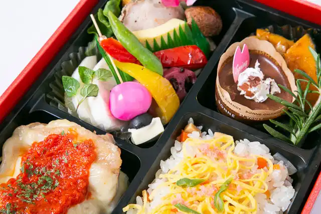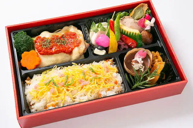 ちらし寿司200g/イタリアンチキン(トマトソース)/ピクルスのフライ/テリーヌ/れんこんのブルーベリー甘酢漬け/かぼちゃとくるみのロースト・バルサミコソース/かぶとグレープフルーツのチャービルサラダ/チョコムースケーキ/うずらのピンチョス/マッシュルームのグリル/パプリカのグリル/にんじんのグラッセ(さくら)/ローストポーク/いんげん/ブロッコリー