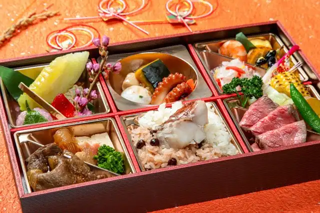 黒毛和牛すき焼き、黒毛和牛ローストビーフ、海老旨煮、紅白なます、黒豆松葉、鱧しんじょう、蛸柔らか煮、炊き合わせ、鯛めし80g、赤飯80g、季節の果物、その他副菜
