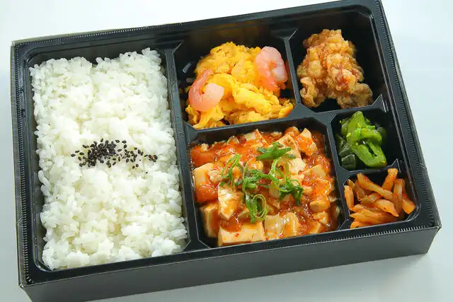 ご飯220g / 麻婆豆腐 / 海老卵 / 唐揚げ / ザーサイ / 漬物