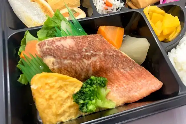 ご飯180g/梅干し/黒ゴマ/漬物/木の葉南瓜煮/揚げ春巻き/花蓮根/青菜のお浸し/春雨サラダ/玉子焼き/鶏肉の八幡巻/笹かまぼこ/煮物/オムレツ/赤魚の仙台味噌焼き