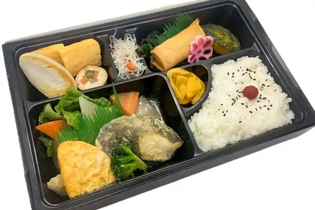 ご飯180g/梅干し/黒ゴマ/漬物/木の葉南瓜煮/揚げ春巻き/花蓮根/青菜のお浸し/春雨サラダ/玉子焼き/鶏肉の八幡巻/笹かまぼこ/煮物/オムレツ/鱈の仙台味噌焼き